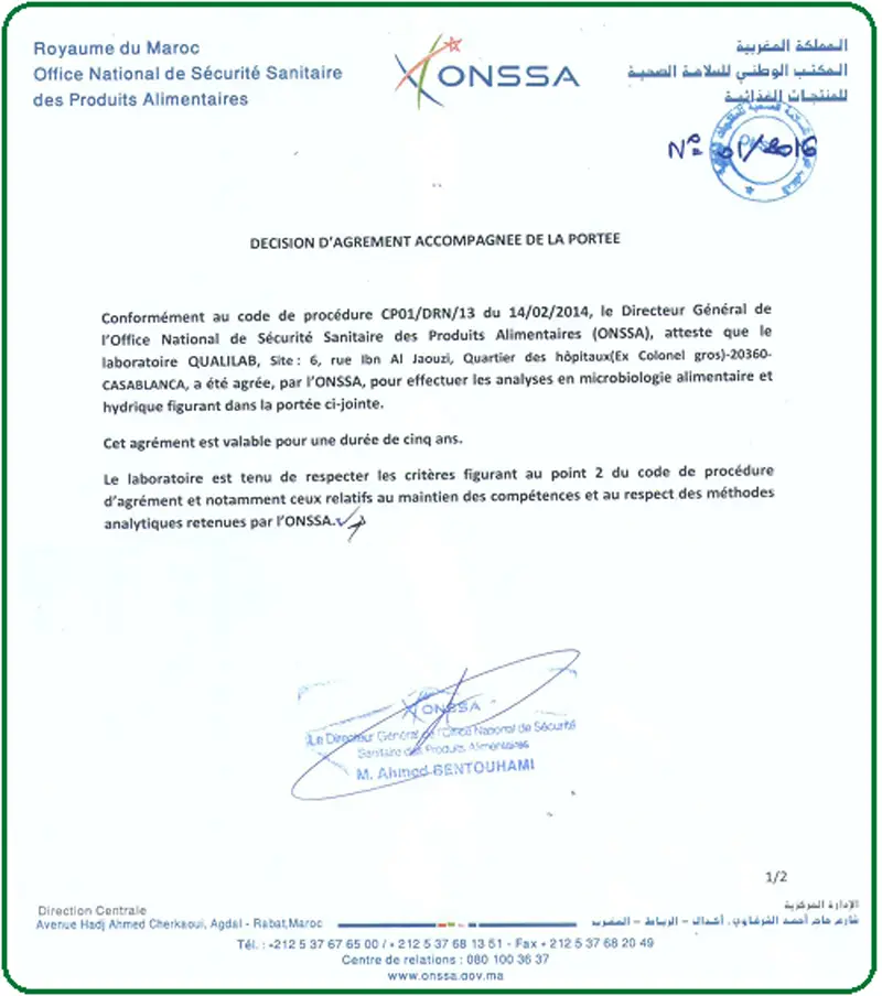 - Agrément ONSSA : Nous bénéficions également de la reconnaissance et de l'agrément de l'Office National de Sécurité Sanitaire des Produits Alimentaires (ONSSA), gage de notre conformité aux normes nationales les plus strictes.